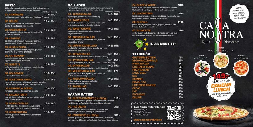 Casa Nostra Kjula är mötesplatsen för dig och det italienska köket. Med stor erfarenhet och passion för goda råvaror garanterar vi att du alltid välkomnas med omsorg och lämnar med ett leende om läpparna! Vi har fullständiga rättigheter.